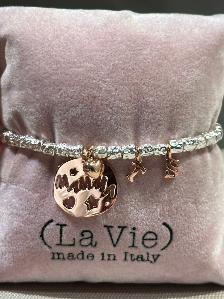 UN BRACCIALE CHE EVOCA LA PAROLA PIÙ DOLCE DEL MONDO.. MAMMA, IMPREZIOSITO DA UN CUORICINO BOMBATO IN ARGENTO925 BAGNO ORO ROSA.