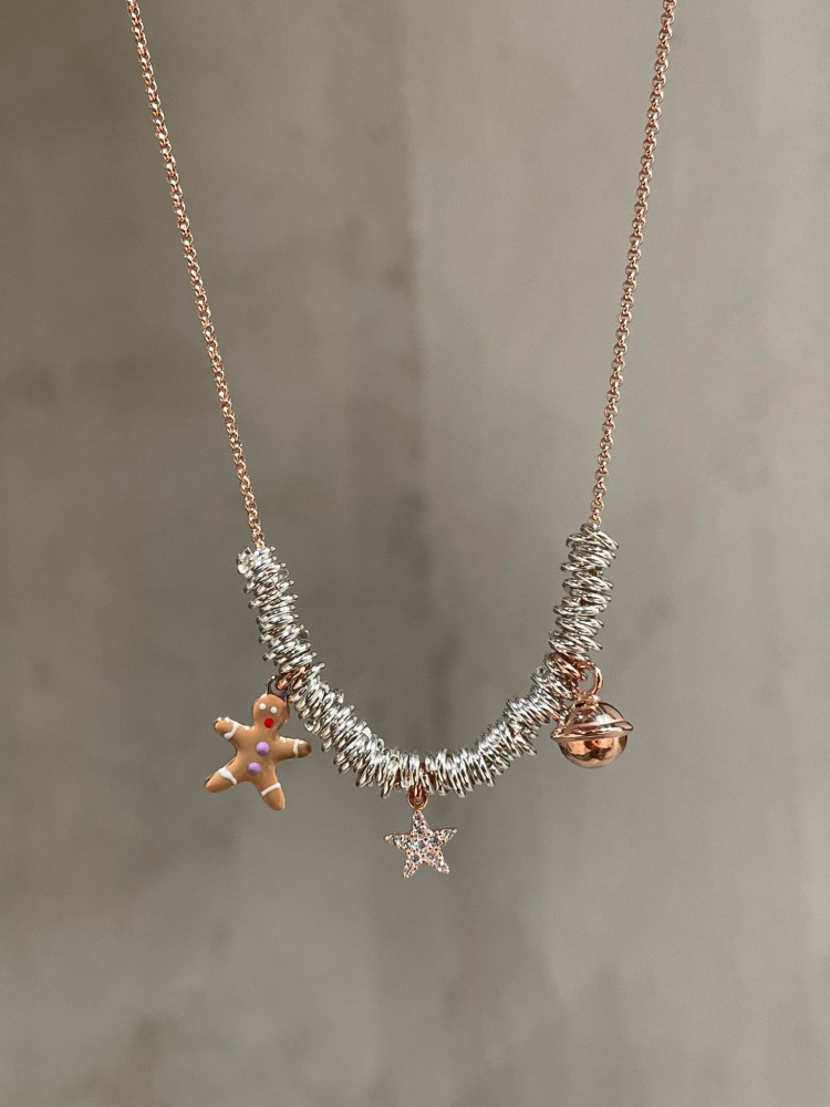 GIROCOLLO CATENA IN ARGENTO BAGNO ORO ROSA CON MICROTONDINI IN ARGENTO E TRE CHARMS DI NATALE, OMINO PAN DI ZENZERO, STELLA PAVE' DI ZIRCONI BIANCHI E CAMPANELLINO.