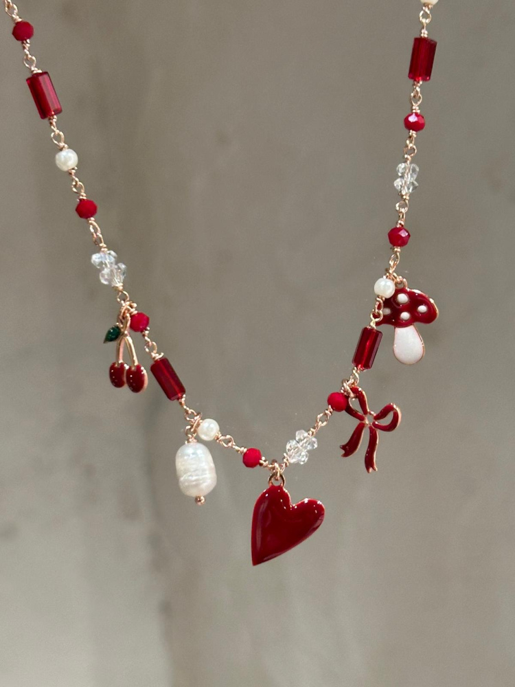 GIROCOLLO BASE ROSARIO DI PIETRE DURE BURGUNDY E PERLE NATURALI E 5 CHARMS IN ARGENTO925 BAGNO ORO ROSA E SMALTO .