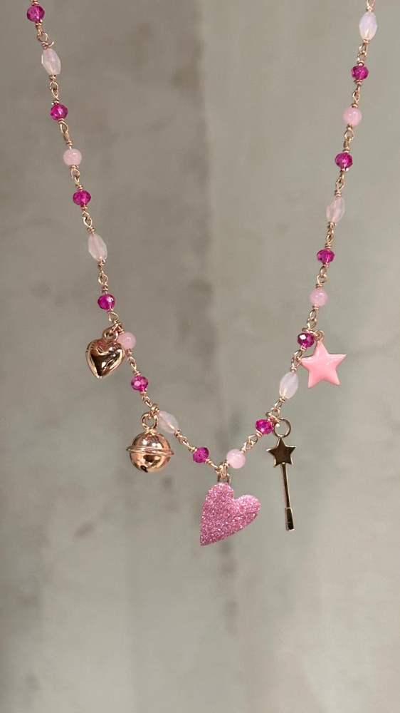GIROCOLLO ROSARIO PIETRE FUXIA E ROSA TENUE MONTATE  MANUALMENTE SU CATENA IN ARGENTO 925 BAGNATA ORO ROSA E CINQUE CHARMS IN AG925 BAGNATO ORO ROSA, ALCUNI SMALTATI E GLITTERATI.