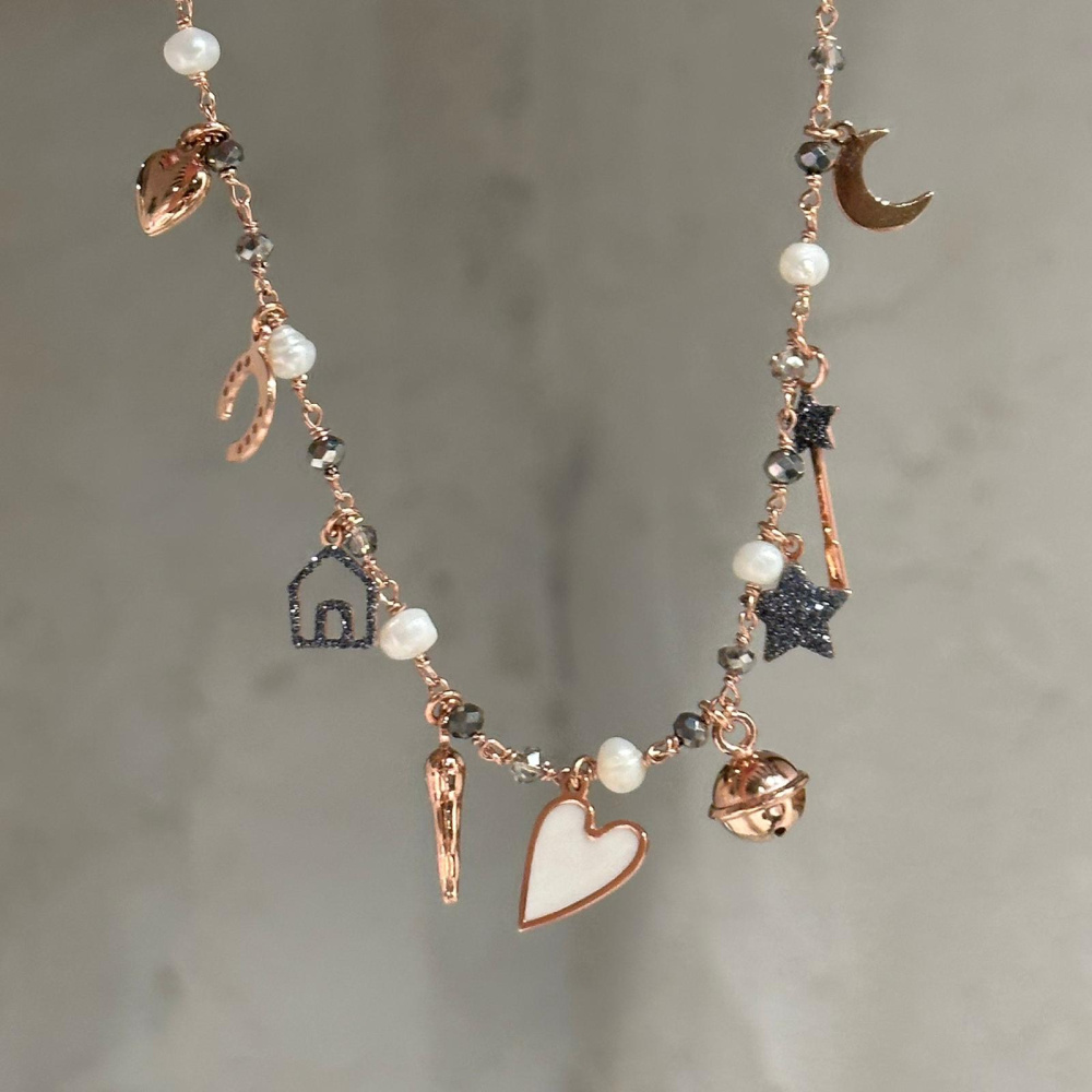PIETRE DURE EMATITE E PERLE NATURALI BIANCHE MONTATE MANUALMENTE SU CATENA IN ARGENTO 925 BAGNATA ORO ROSA E MULTICHARMS IN AG925 BAGNATO ORO ROSA ( ALCUNI SMALTATI ) .