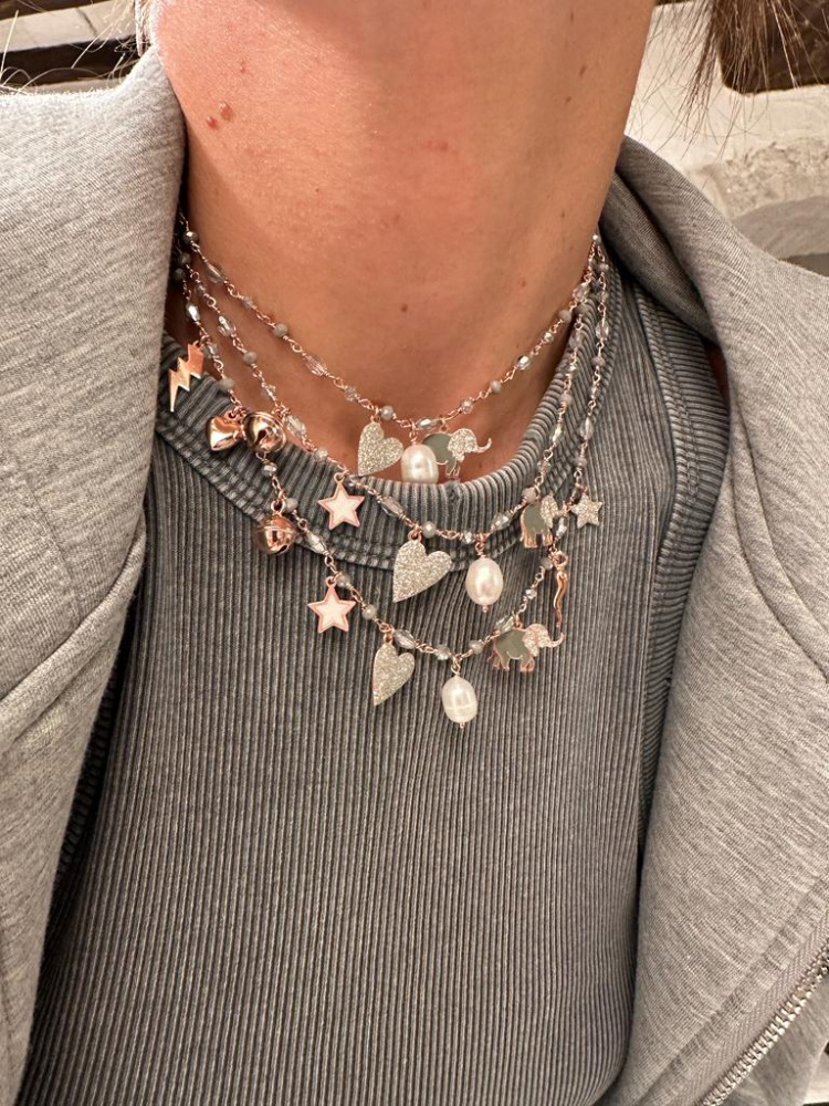 PIETRE DURE SFUMATURE DI GRIGIO MONTATE MANUALMENTE SU CATENA IN ARGENTO 925 BAGNATA ORO ROSA E CINQUE CHARMS IN AG925 BAGNATO ORO ROSA, ALCUNI SMALTATI O GLITTERATI .