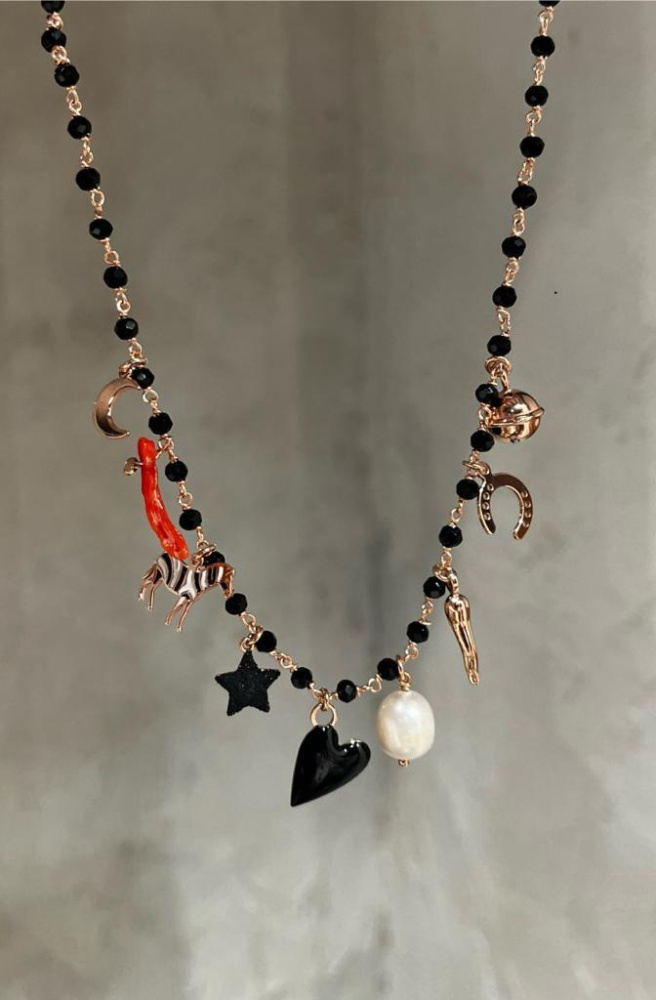 GIROCOLLO ROSARIO BASE PIETRE DURE NERE MONTATE MANUALMENTE SU CATENA IN ARGENTO 925 BAGNATA ORO ROSA E NOVE CHARMS IN AG925 BAGNATO ORO ROSA, ALCUNI SMALTATI O GLITTERATI , RAMO DI CORALLO E PERLA NATURALE.