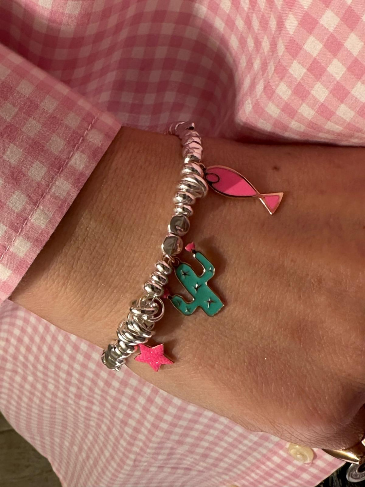 BRACCIALE TBAR CON PEPITE SCHIACCIATE,RONDELLE E NODI CHARMS IN AG925 SMALTATI A MANO CACTUS, STELLA, PESCIOLINO