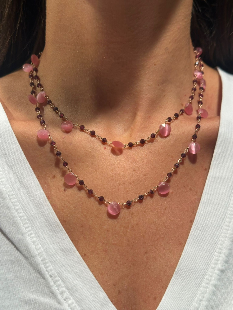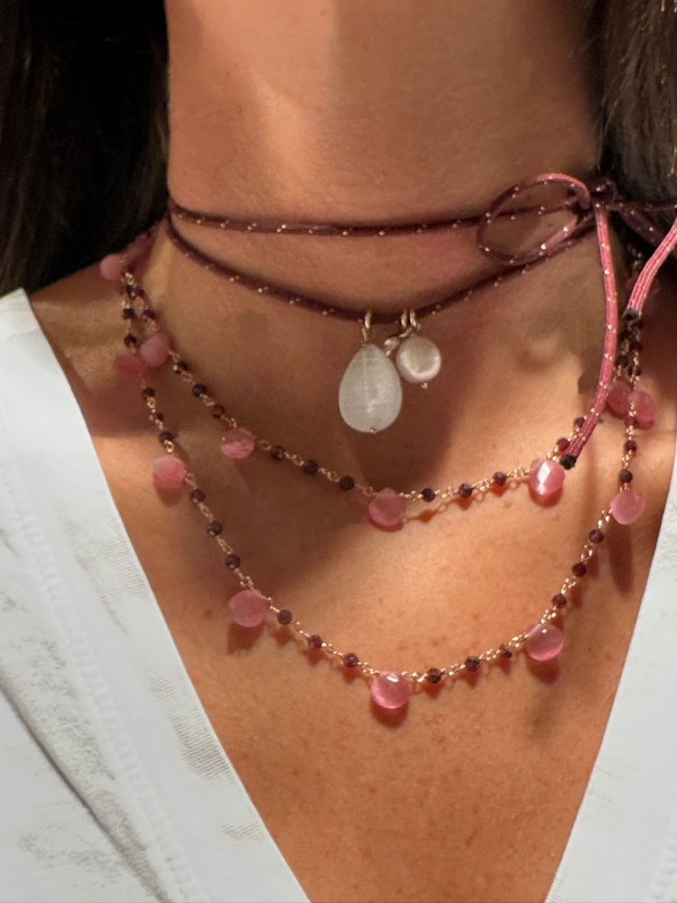 UN GIROCOLLO SUPER RAFFINATO REALIZZATO CON PIETRE DI LUNA ROSA A GOCCIA . BELLISSIMO DA SOLO O ABBINATO ALLA STESSA COLLANA IN VERSIONE PIÙ LUNGA.