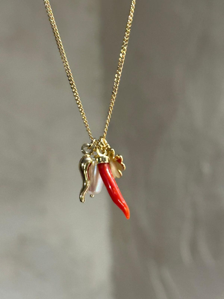 GIROCOLLO CATENA GRUMETTA 42+3 cm IN ARGENTO925 CON CHARMS PERLA NATURALE, CORNO IN CORALLO, QUADRIFOGLIO E CORNINO IN ARGENTO925.