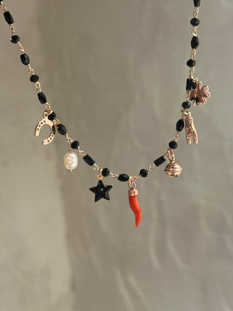 GIROCOLLO BASE ROSARIO DI PIETRE DURE NERE E 7 CHARMS IN ARGENTO925 BAGNO ORO ROSA E SMALTO .
